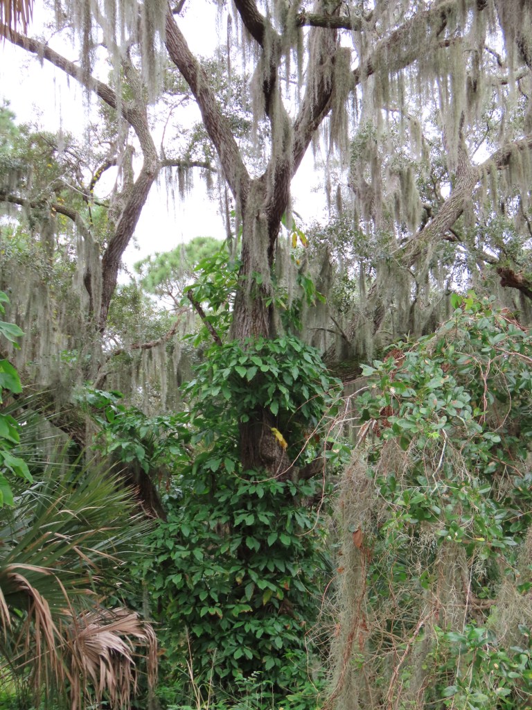There were no red bugs there and the origin of the name has been attributed to a tiny mite commonly found in dry open areas and possibly to the red dragonflies by the water’s edge. There were plenty of birds – Storks, Ibises, Anhingas, green and blue Herons, Limpkins, Waterfowl, Osprey and Hawks. However, the purpose of this hike organized by the Sarasota Audubon Society, was to raise environmental awareness and to discuss the effect that sea level rise is having on this area. A biologist from the society pointed out all the invasive plants growing in the preserve and there were quite a few notably the Air Potato, a vine from the tropics that is disrupting native trees and undergrowth. There are no native insects or diseases to keep its growth in check. Climate conditions are allowing such invasive species to invade native habitats. Invasive species cost Floridians more than $500 million each year. More importantly, invasive species are one of the leading causes of extinction. Learning to identify the invaders is the first step in controlling them. Native plants are always desirable because they conserve water, prevent erosion and create wildlife communities.